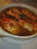 ワインのカーブにずらりとワインが並ぶ。多彩なア・ラ・カルトで、ワインの種類も豊富。 海老をオイルフォンデュ風に仕立てた海老のガーリックオイル焼き、これがみんなにバカうけ! 鴨のオレンジソースとか,その他の料理もかなりなおいしさなのだが、 みんな、海老オイルとそこに沈んでいる海老+大蒜エッセンスを バケットにつけて食べるのに夢中! 海老のガーリックオイル焼きたべたさに、時々行くのだが ワインもそして料理もとても楽しめるお店! 写真を撮った日には渡りガニのリングイーネパスタ フェタチーズのサラダも頼んでぱくぱく |