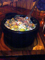 うちの近くの居酒屋さん「わ」でディナー。 入り口がまあるくてちょっと入るのに勇気が要ります。 でっかいスピーカー、アメリカンロックが流れて、雰囲気はなかなかいーです。 座敷は古ぼけた竹で囲ってあり、面白い雰囲気ですが、ぷにが股関節痛で あぐらかけないので赤いいすのテーブルにかけました。 まずは飲み物・・・続いてつきだしの枝豆。 サラダは海のサラダ、ちょっとあぶったサーモンと海草、 バルサミコ入りドレッシングはさっぱりおいしいです。 冷シャブさらだもキャベツたっぷり、豚肉あっさりといー感じ。 トントロ・・塩はともっちご注文。タレもありましたが塩を注文。こだわりがあるようです。 エビチリは、けっこう甘辛。たいていの皿には、ざく切りのキャベツがついてます。 ホルモンから揚げ、レゲエ豚、そして大海老の炭火焼も頼みました。 海老はちょーさしとかないと紺姫に怒られるからなぁ。 んー、われわれの基準ではこれは大海老ではありません(笑) 〆はレゲエ丼とわ丼。レゲエ丼はキムチ入り、わ丼は雑魚入り石焼ビビンバです。 デザートはともっちがコロコロケーキを注文。ホットケーキを丸く焼いたものですね。 ちょっとばさばさしてるので、メープルシロップが欲しかったかな。 居酒屋さんなのと、若い人ターゲットのせいか、かなり味が濃いです。 店員さん、特に若いレディの方の気の使い方はとてもいい感じです。 さっさんにレガシィ運転してもらって帰り、ともっちの居酒屋初体験は楽しく終わりました。 |