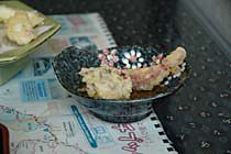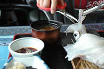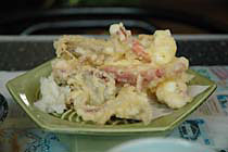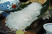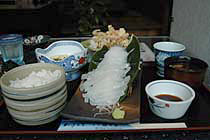 須佐の男命烏賊(みこといか)・・・剣先イカのことのようです ひさしぶりに透き通った活きのいいイカを食べさせてもらいました。 釣りたて、活きたイカを食べたことのある人ならしっている 独特のこりこりした歯ごたえともっちり感のハーモニ〜 イカ天丼もうまいです。さくさく、こりこり♪ げそとエンペラは+200円で天婦羅にしてもらうこともできますが、 刺身好きな人には,はさみでチョキンときって わさび醤油の中で動くげそをパクリ・・・ってのをお勧めします 口の中で吸盤がくっつきますが・・・(笑) エンペラはきりにくいけど、いっそう、こりっこりです とんかつ,ハンバーグといった普通のメニューもあるので お子様連れでも気楽に食事できます。 いっきにお気に入り。 |